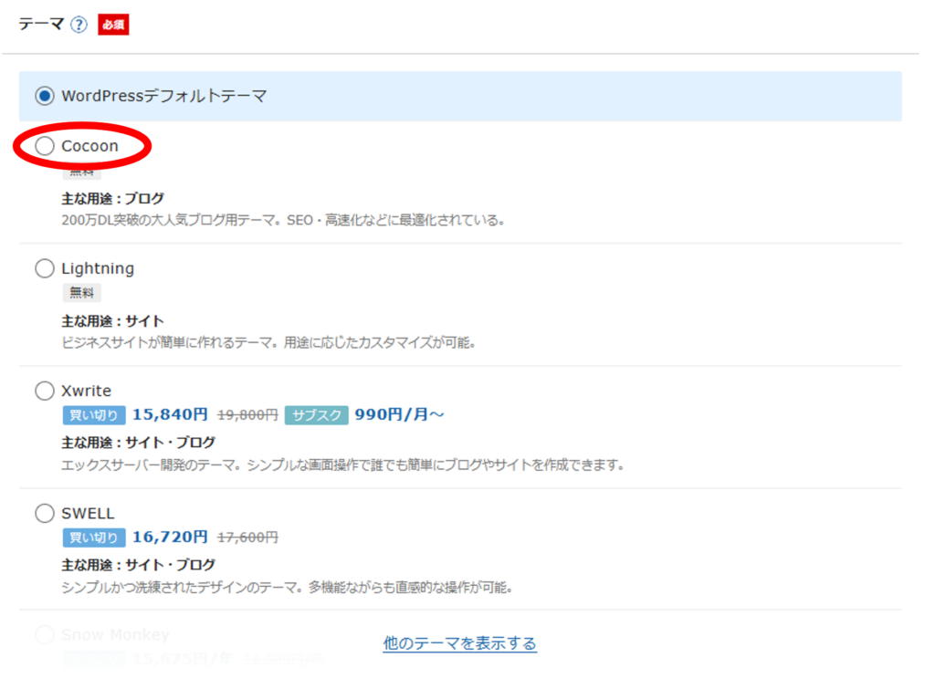 初心者の方は無料テーマの「Cocoon」を選んでおけば問題ありません。