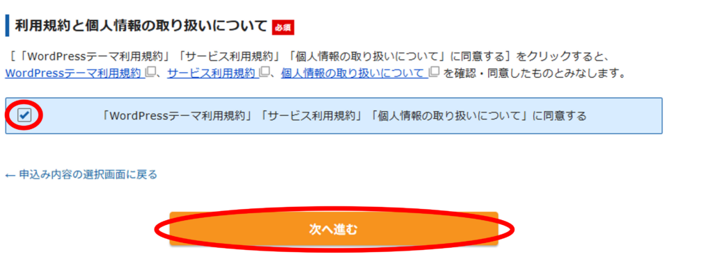 上記を入力して個人情報取り扱いにチェックして「次へ進む」を押します