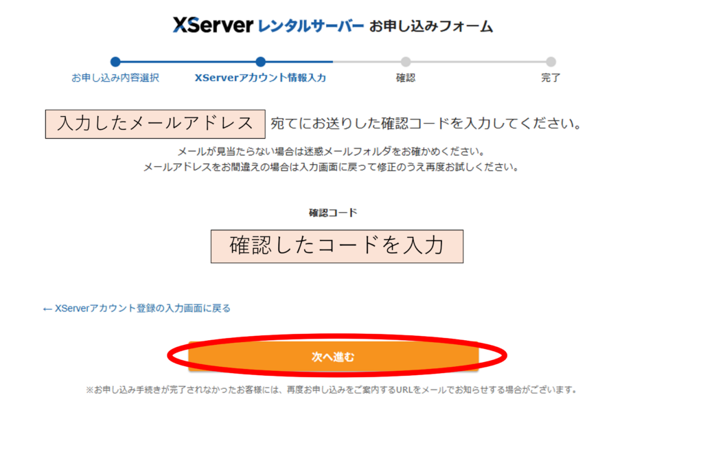 登録したメールアドレスに確認コードが届くので、正しく入力して「次へ進む」を押します。