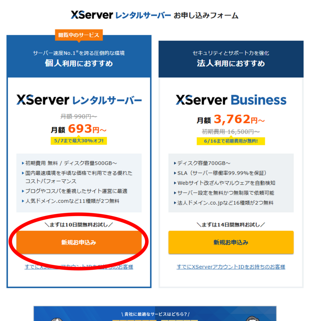 XServerレンタルサーバー新規申し込みを押します。