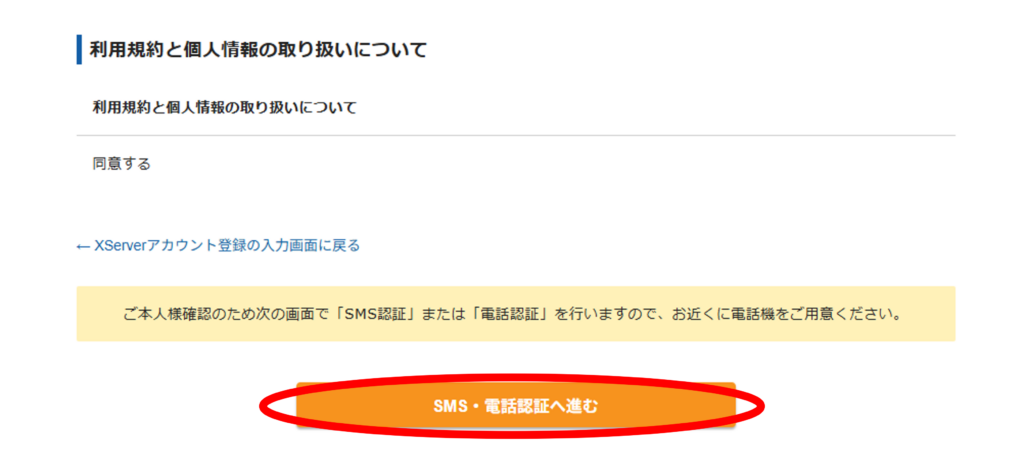 入力した内容に間違いがなければ「SMS・電話認証へ進む」を押します