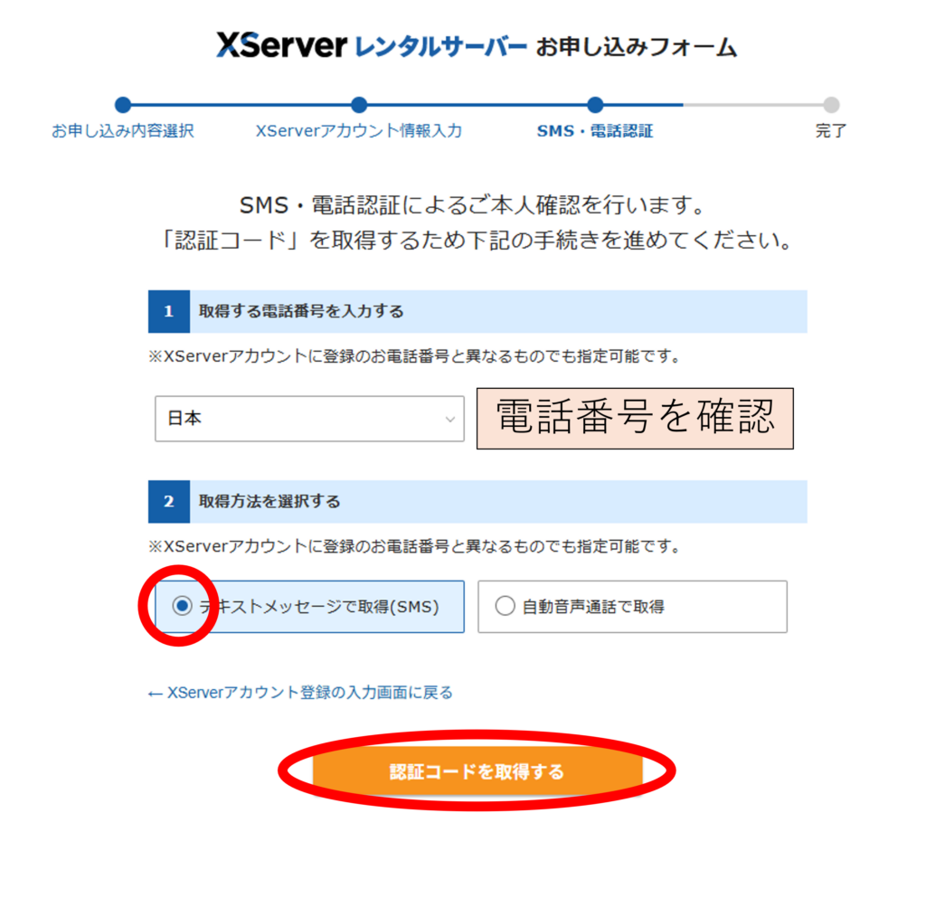 電話番号が正しいことを確認し、テキストメッセージで取得にチェックを押し「認証コードを取得する」を押します。
