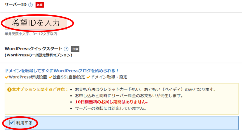 サーバーIDを入力し、WordPressクイックスタートを「利用する」にします。
